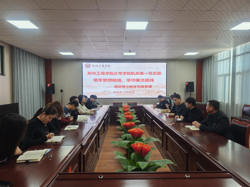 10月28日,郑州工商学院兰考学院机关第一党支部在24号楼105会议室举办“筑牢思想防线,坚守廉洁底线”廉政警示教育专题党课。
